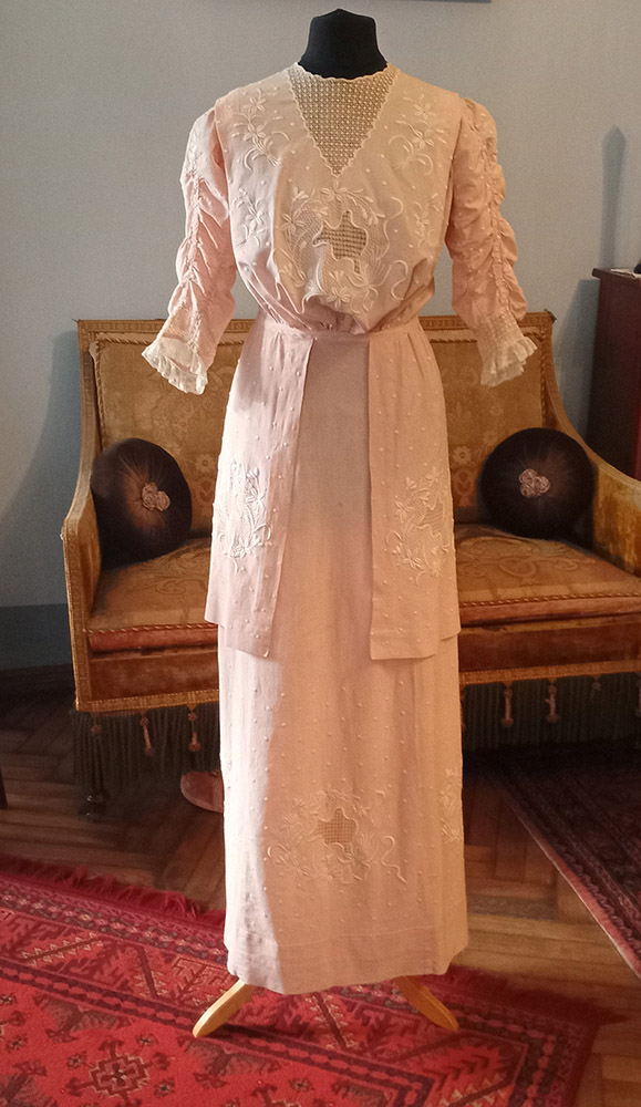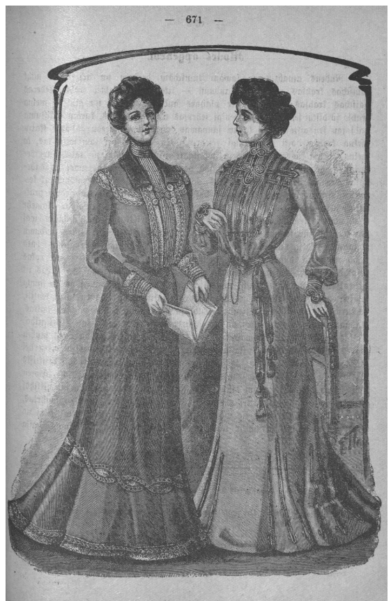 Savukārt, padomu un ieteikumu grāmatiņā “Nepieklājas” (Rīga, 1912. gads) norādīts: “Nepieklājas drēbes pārāk daudz izgreznot. Tagadējā vispārīgā pārmērība izgreznojumos tuvojas stipri mežoņu garšai un paradumiem, un pierāda pirmo skaistuma likuma nezināšanu, kuri aptver jēgumu, ka vienkāršība ir allaž pirmais tikums. Apģērbs, kas no augšas līdz apakšai apšūts lentēm, nevar patikt ne Dievam, ne cilvēkiem. Visus pārspīlējumus izglītotā kārta var atstāt ākstiem. Nepieklājas verdziski kalpot modei. Jāuzticas vairāk sava paša garšai un spieģelim nekā skroderenes ieteikumam un modes lapām. Kā tas iespējams, ka liela un maza sieviete var valkāt izskatā vienādus apģērbus, bet ka viena vaj otra neizskatītos jocīgi?” Par kleitas aprakstu paldies Modes muzeja kuratorei un projektu vadītājai Agritai Grīnvaldei.