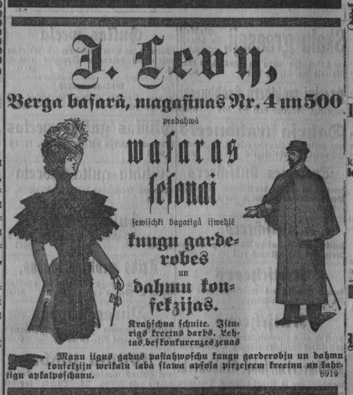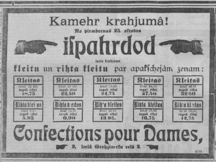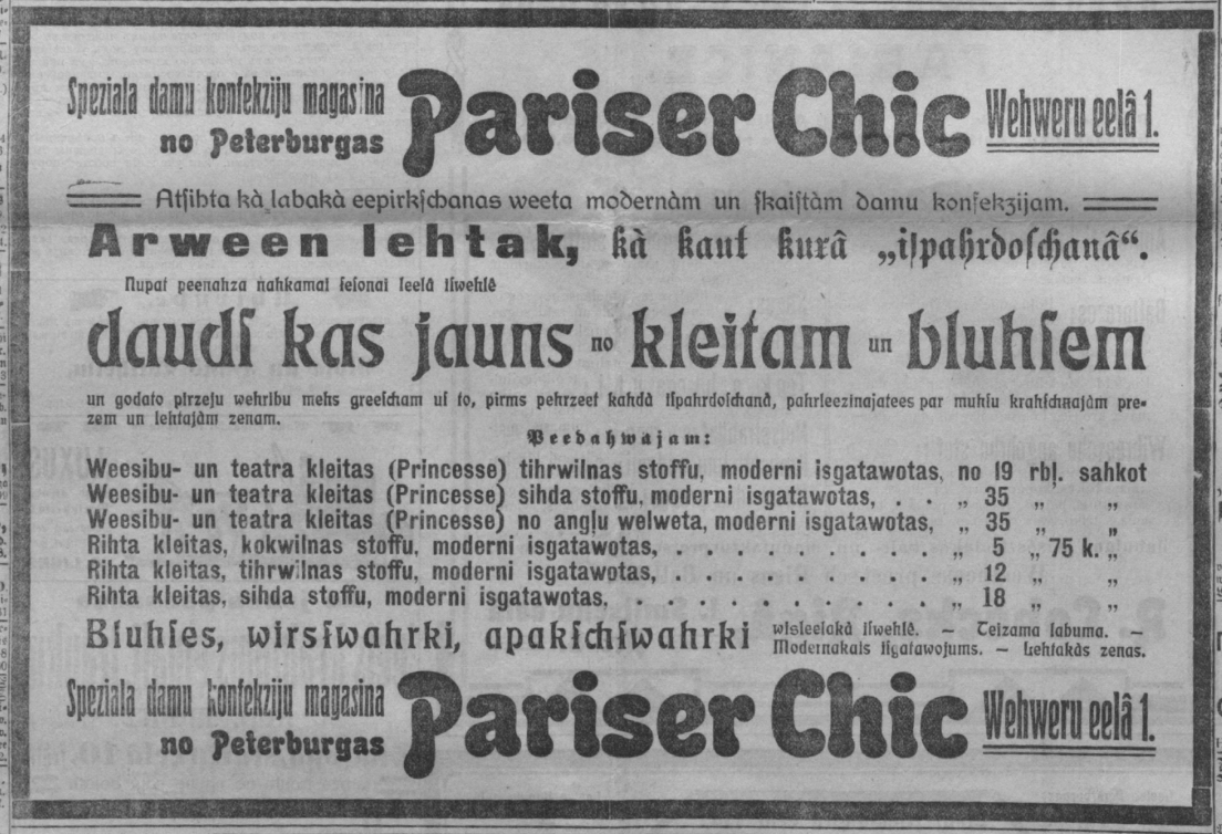 Netrūka arī gatavo apģērbu veikali ar visdažādāko cenu diapazonu, to reklāmas lakrakstu lappusēs bija lasāmas itin bieži, dažubrīd bija norādītas arī kleitu cenas. “Speciāla dāmu konfekciju [gatavo apģērbu] magazina “Pariser Chic” Vēveru [Audēju] ielā 1” piedāvā Viesību un teātra kleitas (Princesse) tīrvilnas, moderni izgatavotas – no 19 rbļ. sākot., zīda vai angļu velveta – no 35 rubļiem sākot, rīta kleitas, atkarībā no materiāla (kokvilnas, vilnas vai zīda) – attiecīgi no 5,75, 12 vai 18 rubļiem. Protams, lētāk tērpus varēja iegādāties dažādās izpārdošanās.