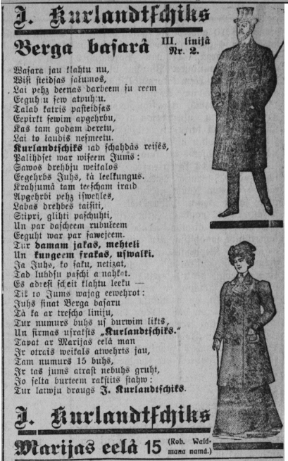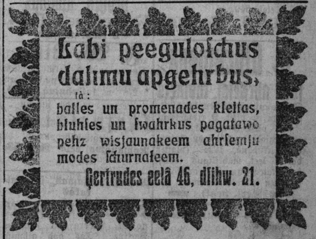 Jūgendstila laikā rīdzinieki tērpus sev varēja noskatīt dažādos ārzemju modes žurnālos un pasūtīt pie šuvējām, par ko liecina sludinājumi laikrakstos. “Labi piegulošus dāmu apģērbus, kā balles un promenādes kleitas, blūzes un svārkus pagatavo pēc visjaunākiem ārzemju modes žurnāliem. Ģertrūdes ielā 46, dzīv. 21” (“Jaunākās Ziņas”, 1912. gada 3.marts).