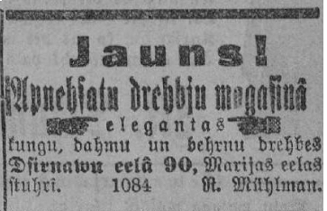 Jau jūgendstila laikā Rīgā pastāv arī lietotu apģērbu veikali. “Apnēsātu drēbju magazinā elegantas kungu, dāmu un bērnu drēbes Dzirnavu ielā 90, Marijas ielas stūrī” (Dzimtenes Vēstnesis, 1910. gada 23. janvāris).