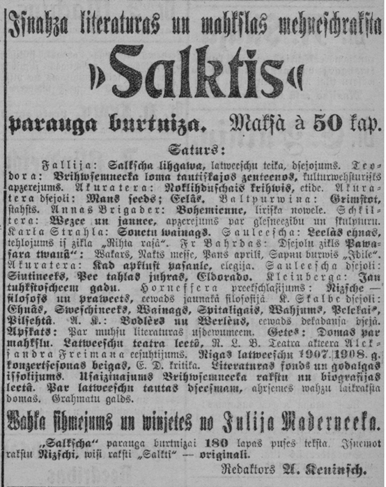 Laikraksts “Balss” 1906. gada 22. decembrī vēsta: “”Zalkša” Grāmatu Apgādniecība nupat nākusi klajā ar jaunu literatūras un mākslas pasākumu, kas katrā ziņā pelna nopietnu ievērību. Apgādniecība uzsākusi izdot periodisku izdevumu “Zalktis”, ceturkšņu raksta krājumus mākslai un kritikai. Pirmais numurs nupat iznācis. Tas ir 23 drukas loksnes biezs un ļoti grezni izdots: uz skaista moderna papīra un ar daudz oriģinālvinjetēm. Saturs nopietns un interesants, tikai oriģinālraksti. „Zalktim" kā bezmaksas pielikums iet līdz J. Rozentāla 4 krāsu oriģināllitogrāfija „Māte", kas atsevišķi pērkot, maksā 2 rubļi. Šāds mākslas pielikums līdz šim pie latviešiem pirmais. „Zalkti" rediģē J. Rozentāls, A.Sauliets, A.Ķeniņš. “Zalktis" I—IV maksā abonentiem 4 rubļi, atsevišķi pērkot à 1 rub. 50 kap. Katrs numurs būs sevī pilnīgi noslēgts. Par „Zalkša" mākslas virzienu var spriest no redakcijas sastāva. Pēc tam, kad mūsu agrākie žurnāli jau gadu kā apstājušies iznākt un jaunie vēl jauna nav nesuši, it kā sevis un „jaunās" publikas meklē, ar prieku aizrādam uz šo spēcīgo atvasi no „vecā" mākslas koka. „Zalktis" ir grezna svētku dāvana.”